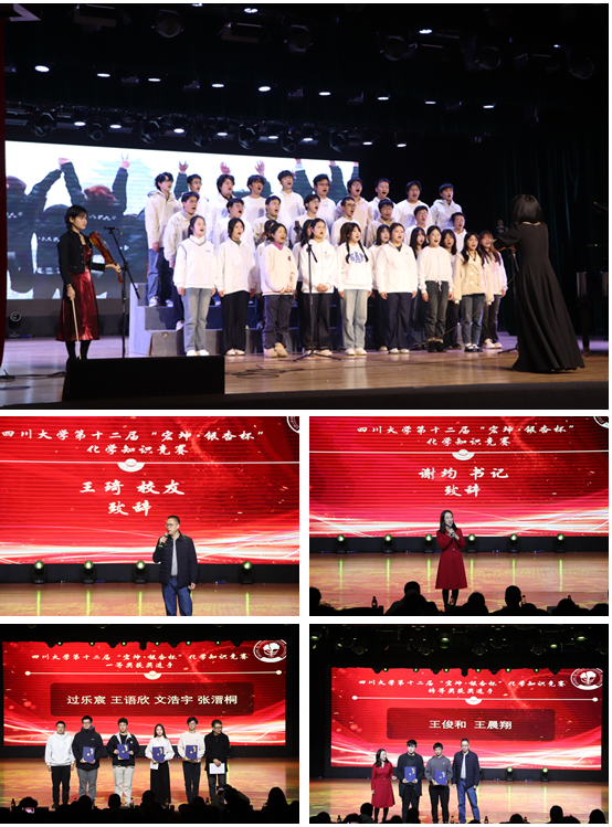 颁奖典礼在化学学院合唱团带来的《有我》合唱开场表演中拉开序幕。首先由王琪校友致辞,他对同学们致以美好祝愿,鼓励同学们积极向上,并对母院化学学科进行ESI全球排名前万分之一表示衷心的祝贺。随后,谢均书记发表致辞,她鼓励同学们通过这次晚会增进交流,加强团结,并对获得奖项的同学致以祝贺。