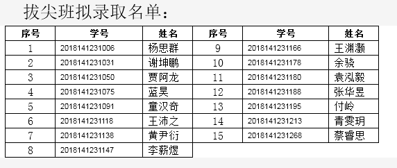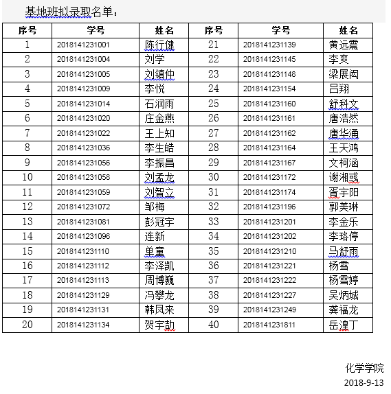 化学学院秉承公开、公正、公平的原则,通过同学自愿报名、学院笔试、综合面试等程序,最终确定以下同学进入2018级化学学院拔尖班、基地班,现予以公布: