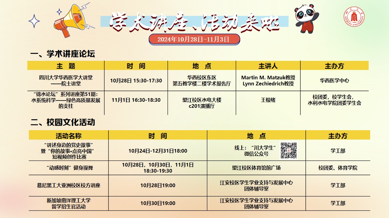 学术讲座论坛及校园文化活动预告(2024年10月28日-11月3日)