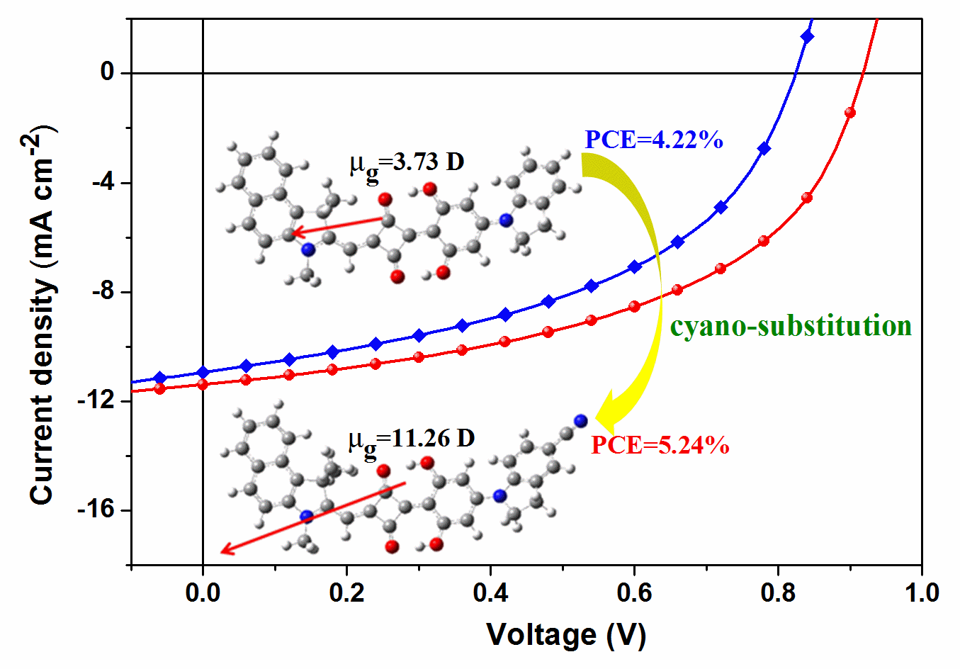 17. Daobin Yang; Jiao Yan; Lin Yang; Yao Chen; Yan Huang*; Xuemei Pu; Zhiyun Lu*; Hisahiro Sasabe*; Junji Kido*: Cyano-substitution on the end-capping group: facile access toward asymmetrical squaraine showing strong dipole-dipole interactions as a high performance small molecular organic solar cells material. Journal of Materials Chemistry A 2015, 3(34):17704-17712.