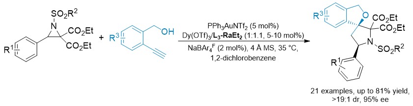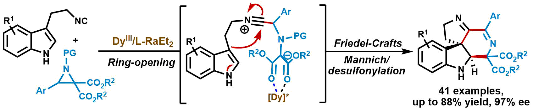 31.Dong, P.; Li, Z. J.; Liu, X. H.; Dong, S. X.*; Feng, X. M.* Asymmetric Synthesis of Polycyclic Spiroindolines via the Dy-catalyzed Cascade Reaction of 3-(2-Isocyanoethyl)indoles with Aziridines. Org. Chem. Front. 2022, 9, 4591.