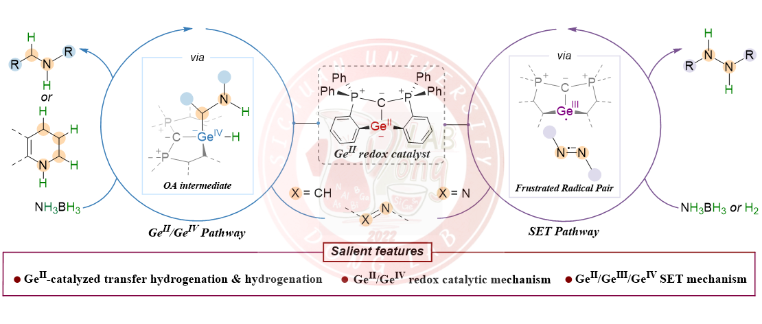 近年来,具有准金属特性的主族元素催化已发展成为有机催化领域的重要前沿方向,其通过利用地球储量丰富、环境友好的主族元素模拟过渡金属的催化行为,为发展绿色、可持续的合成化学提供了新范式。课题组研究工作聚焦于具有准金属特性的低价重十四族元素试剂的精准合成与催化性能,围绕"低价锗、锡试剂的高效创制与功能调控"这一关键科学问题,通过创新配体设计与合成策略,系统开展相关催化体系的构建与反应机制研究。