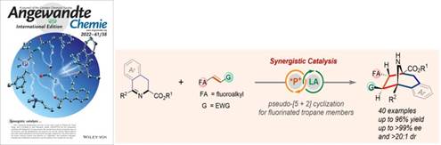 50. Yuan Chen,† Jiajia He,† Cheng Zhuang, Zanjiao Liu, Kai Xiao, Zhishan Su,* Xiaoyu Ren, Tianli Wang* "Synergistic Catalysis between a Dipeptide Phosphonium Salt and a Metal-Based Lewis Acid for Asymmetric Synthesis of N-Bridged [3.2.1] Ring Systems" Angew. Chem. Int. Ed. 2022, e202207334. (Selected as the Inside Back Cover by Angew Chemie)