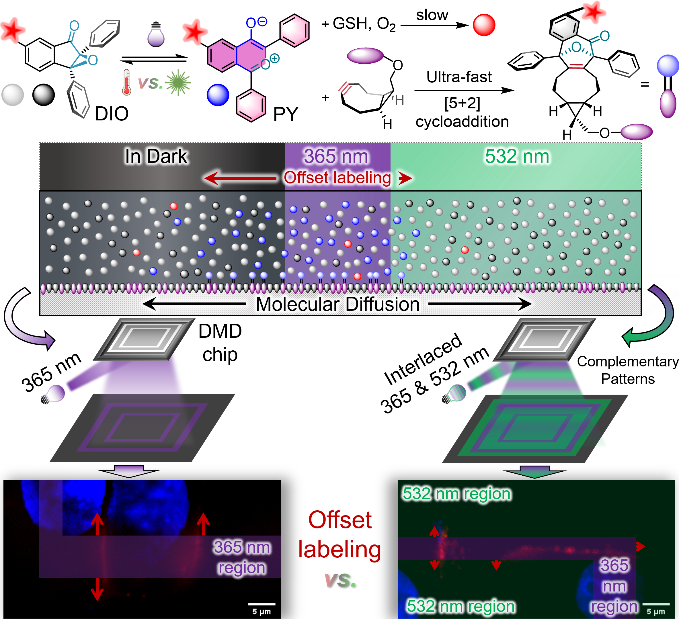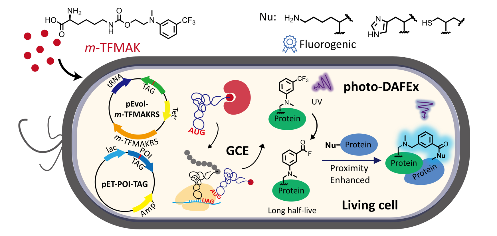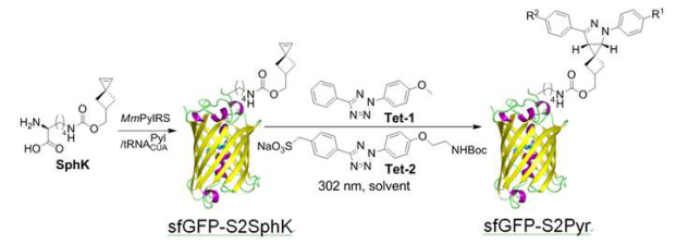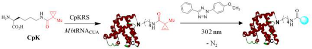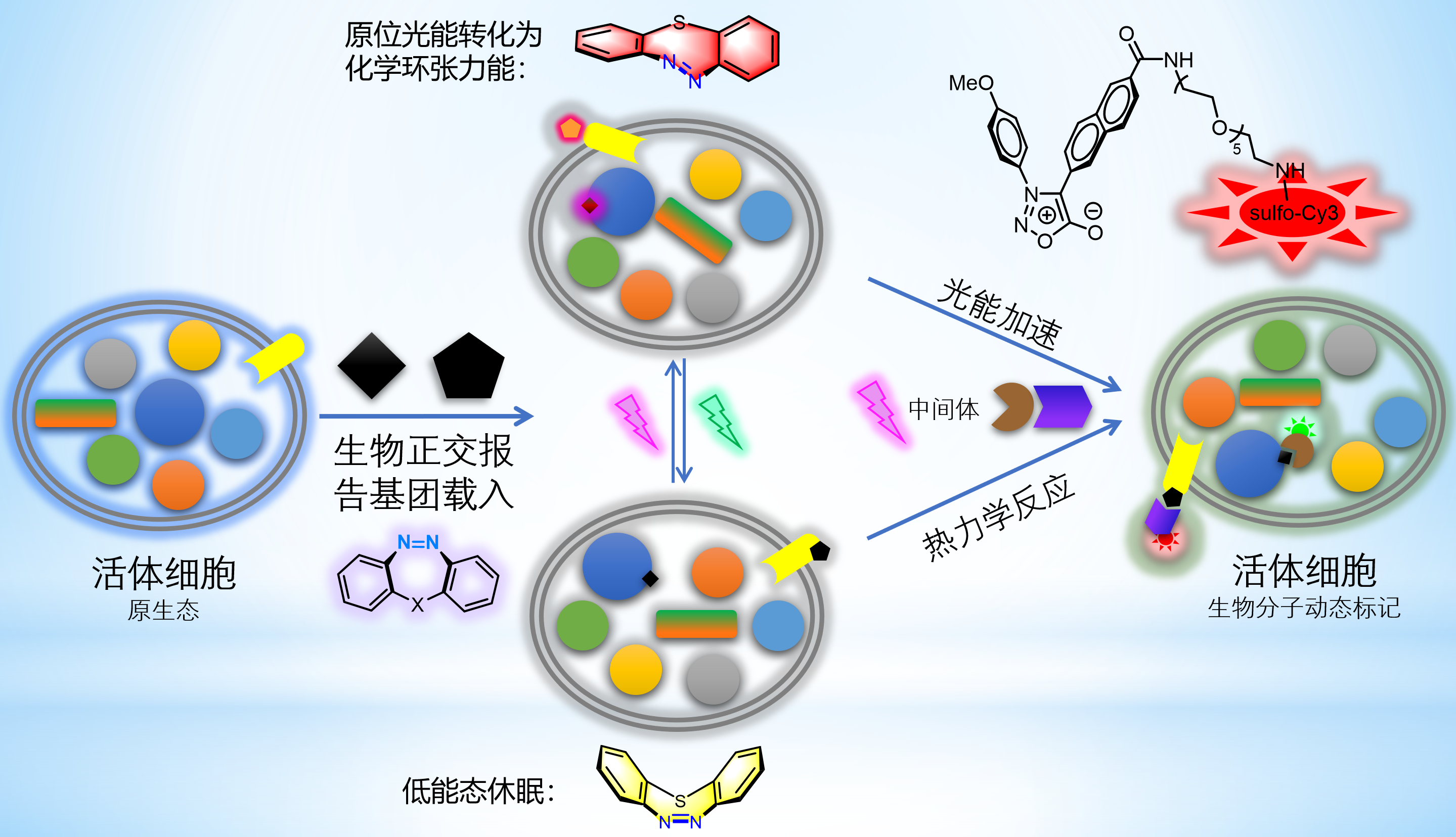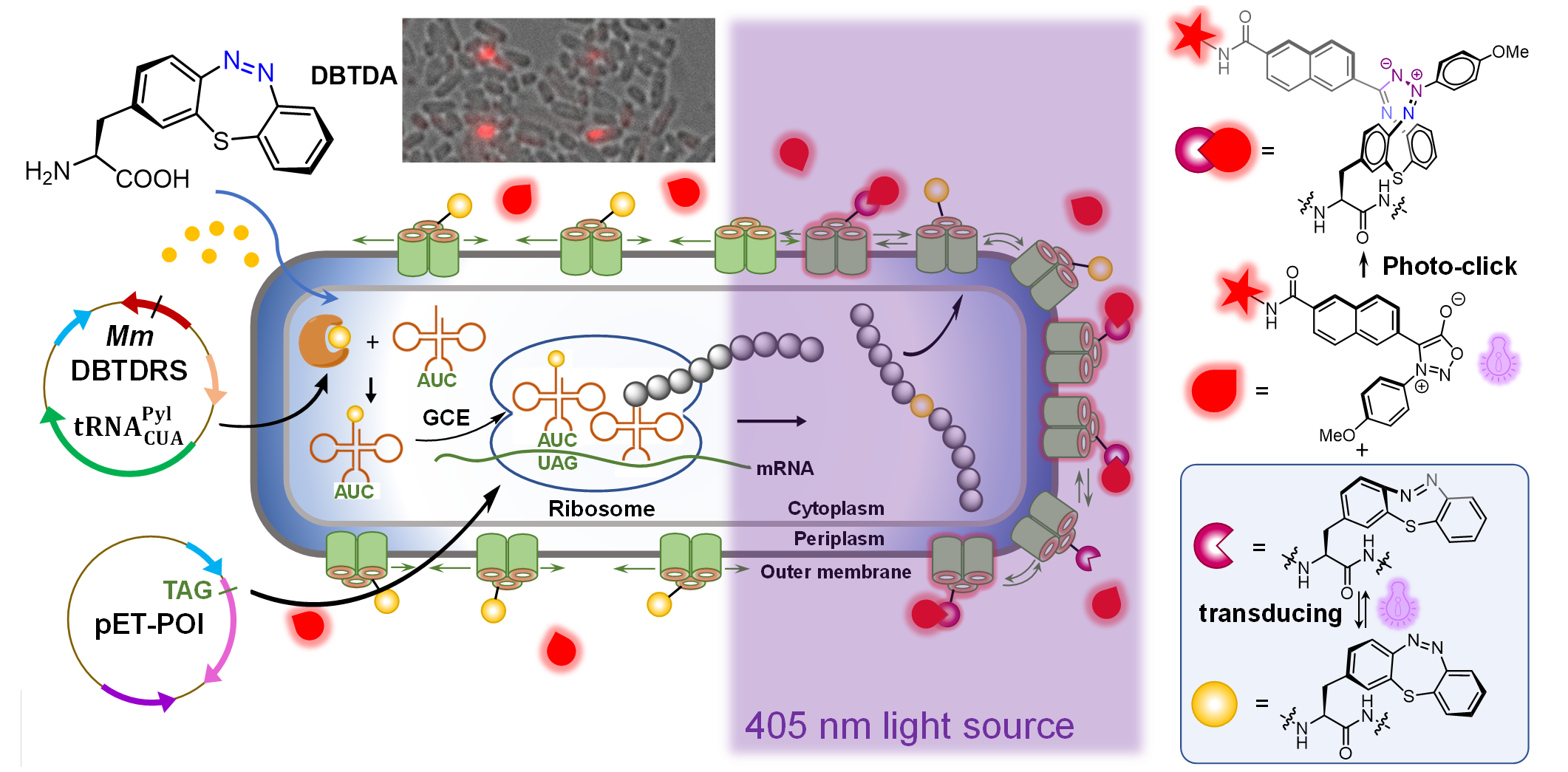 点击化学("click" chemistry)是诺贝尔化学奖得主Sharpless教授在2001年提出的一种快速共价偶联策略。 而"光点击"与"点击"化学的关系是青出于蓝,胜于蓝。它继承了点击反应的优点,同时也是受光激发,实现时空控制构建共价连接的化学利器。 在“光点击”化学反应中,利用直接光转化或者光催化策略,实现生物正交偶联的精准光控,达到亚细胞/单分子级别的时空精准度。采用环张力环融合策略,将“光点击”反应提高10倍以上的反应动力学。利用课题组原创的环偶氮亲偶极体,首次合成DBTD丙氨酸作为非天然氨基酸衍生物,并将其用于遗传密码扩展(GCE)编载重组蛋白质表达,实现超快速活体内蛋白质特定残基的荧光标记。这一系列创新研究,将推进“光点击”生物正交反应在活体动物中的靶标分子的跟踪和操控研究,起到了中流砥柱承前启后的作用。