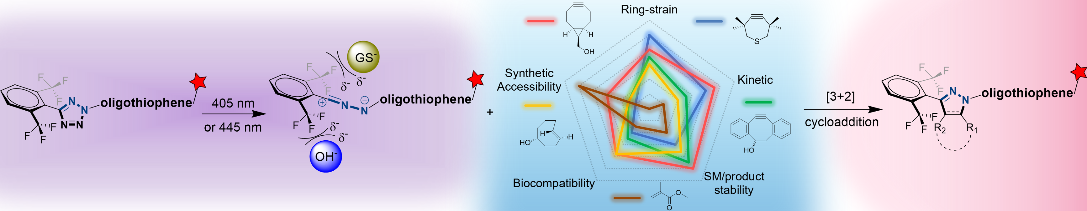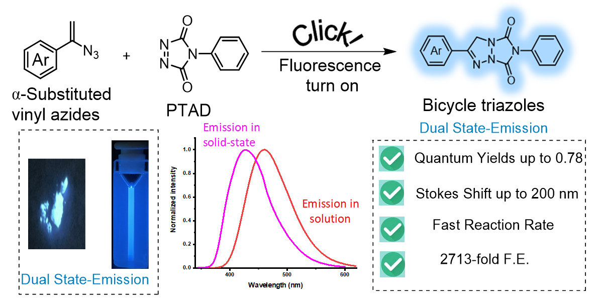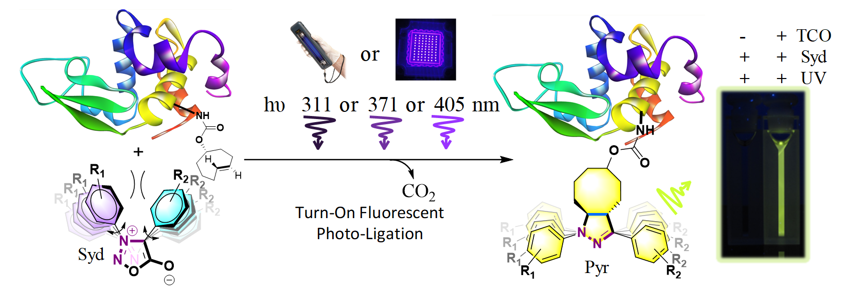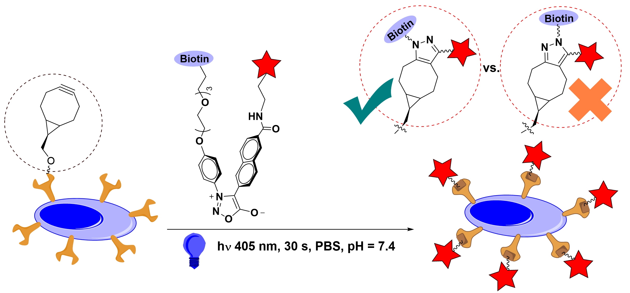 点击化学("click" chemistry)是诺贝尔化学奖得主Sharpless教授在2001年提出的一种快速共价偶联策略。 而"光点击"与"点击"化学的关系是青出于蓝,胜于蓝。它继承了点击反应的优点,同时也是受光激发,实现时空控制构建共价连接的化学利器。 在“光点击”化学反应中,利用直接光转化或者光催化策略,实现生物正交偶联的精准光控,达到亚细胞/单分子级别的时空精准度。采用环张力环融合策略,将“光点击”反应提高10倍以上的反应动力学。利用课题组原创的环偶氮亲偶极体,首次合成DBTD丙氨酸作为非天然氨基酸衍生物,并将其用于遗传密码扩展(GCE)编载重组蛋白质表达,实现超快速活体内蛋白质特定残基的荧光标记。这一系列创新研究,将推进“光点击”生物正交反应在活体动物中的靶标分子的跟踪和操控研究,起到了中流砥柱承前启后的作用。