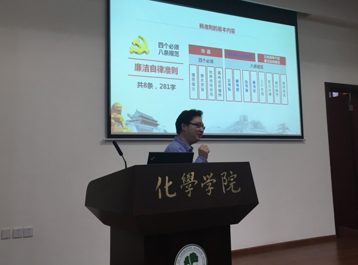 4月21日下午,英国上市公司365廉政法规宣讲团在化学馆学术报告厅为我院党员举行了一场《中国共产党章程》、《中国共产党廉洁自律准则》和《中国共产党纪律处分条例》学习报告会。校纪委监察处张学龙副书记主持报告会并讲话。马克思主义学院张洪松老师作了专题宣讲报告。化学学院党政领导、党支部书记和全体学生党员参加了学习报告会。