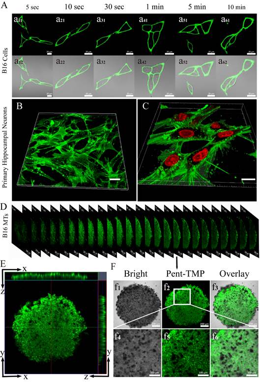 图2. (A) B16细胞以探针孵育不同时间后未经洗涤的荧光图与明场叠加图;原代海马神经元细胞以(B) 探针、(C) 探针和细胞核染料孵育1分钟后的荧光图;(D)多细胞肿瘤球0-120微米的Z轴层扫荧光图;(E) 多细胞肿瘤球的x-y、x-z、y-z轴的荧光强度分布图;(F) Z轴为60微米处的层切图。比例尺:(A-C) 20微米,(D,f1-f3) 200微米,(f4-f6)100微米。