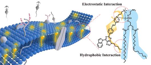 图1. 探针与细胞膜的标记示意图(左);探针与磷脂双分子层的标记策略(右)。