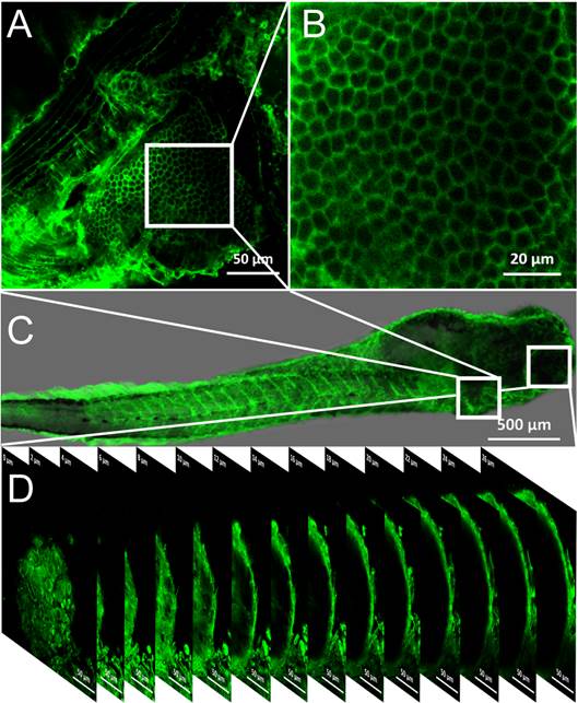 图3. (A) 活体斑马鱼腮部的荧光图;(B)活体斑马鱼腮部的局部放大图;(C)活体斑马鱼整体染色的荧光图;(D)活体斑马鱼眼部0-26微米的Z轴层扫荧光图。比例尺:(A, D) 50微米,(B) 20微米,(C) 500微米。