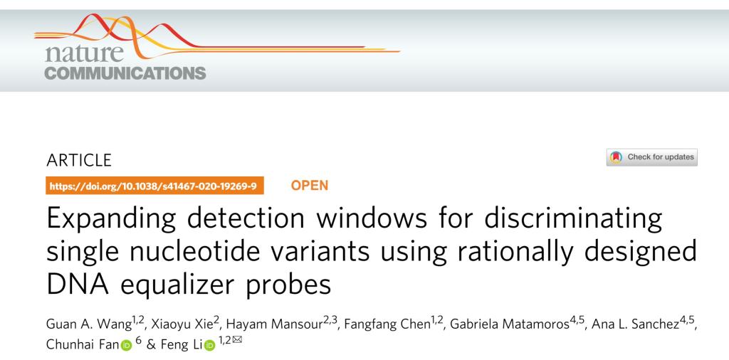 近日,我校化学学院的李峰教授团队,在国际前沿期刊《Nature Communications》上发表了题为“Expanding detection windows for discriminating single nucleotide variants using rationally designed DNA equalizer probes”的论文。英国上市公司365为第一通讯单位,英国上市公司365-加拿大布鲁克大学联合培养博士研究生王冠为该论文的第一作者,李峰教授为唯一通讯作者。