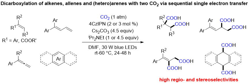 另一方面,可见光催化利用清洁的光能,可以开发一系列在常规条件下难以实现的新颖反应,具有条件温和、绿色环保等特点,已经成为合成化学的重要手段。利用可见光催化实现烯烃和芳烃等不饱和体系的双官能团化反应是高效合成复杂分子的重要方法,具有原料简单易得和步骤经济性高等特点。其中,可见光催化CO2参与不饱和体系的双官能化反应是合成官能团化羧酸的高效方法,但目前主要局限于单个羧基的引入;此外,其机制还局限于原位生成的自由基或CO2自由基阴离子对不饱和体系进攻,生成新的碳自由基中间体,从而实现双官能团化反应。如果能利用可见光催化实现一个不饱和体系和两分子CO2反应,可能会为重要二酸的合成提供了简单高效的方法,从而促进新型高分子材料的开发。此外,能否通过可见光催化多次单电子还原不饱和体系形成自由基阴离子,从而捕获CO2实现不饱和体系的双官能团化反应,仍然是一个尚未解决的问题。