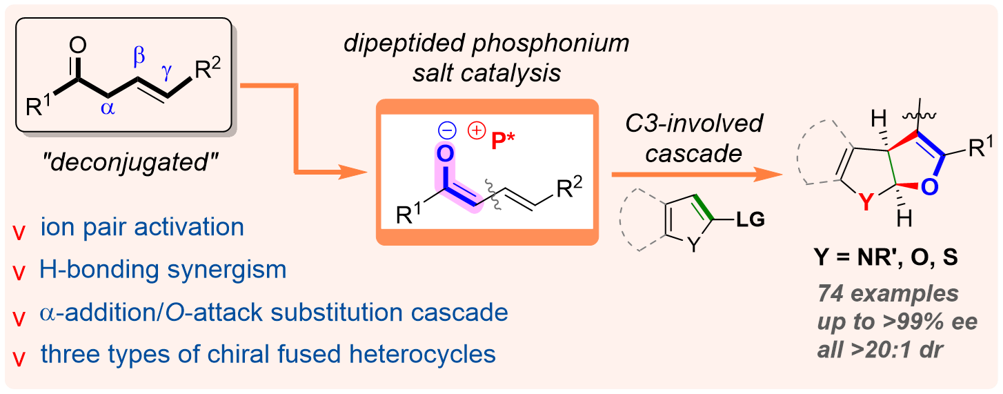 我院王天利教授课题组一直致力于手性肽-季鏻盐催化的不对称合成化学研究,开发了一系列新型高效的多功能手性肽-季鏻盐催化剂、及其催化的新合成方法学。针对上述科学挑战,该团队利用二肽-季鏻盐作为手性催化剂,首次实现了b, g-不饱和酮作为一类新型C3-合成子参与的不对称串联反应,高效高选择性地构建了三类二氢呋喃并[2,3-b]杂环化合物。