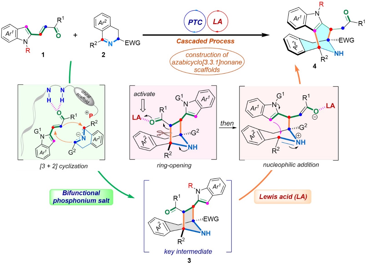 我院王天利课题组一直致力于手性肽-季鏻盐催化的不对称合成化学研究,开发了一系列新型高效的手性肽-季鏻盐催化剂,并成功用于若干富有挑战的有机反应中(例如Angew. Chem., Int. Ed. 2019, 58, 7425-7430;Angew.Chem. Int.Ed. 2021, 60, 14921-14930;Angew. Chem. Int. Ed. 2021, 60, 19860-19870等)。针对上述科学问题并结合课题组前期在构建手性[3.2.1]氮杂七元桥环的研究基础 (Sci. China Chem. 2020, 63, 1091-1099),最近该课题组首次利用双功能季鏻盐催化剂和路易斯酸接力催化策略,以季鏻盐催化串联环化反应得到七元桥环中间体,随后路易斯酸促进该中间体原位开环/扩环,高效高立体选择性的构建了具有多个手性中心的[3.3.1]型氮杂八元桥环骨架。