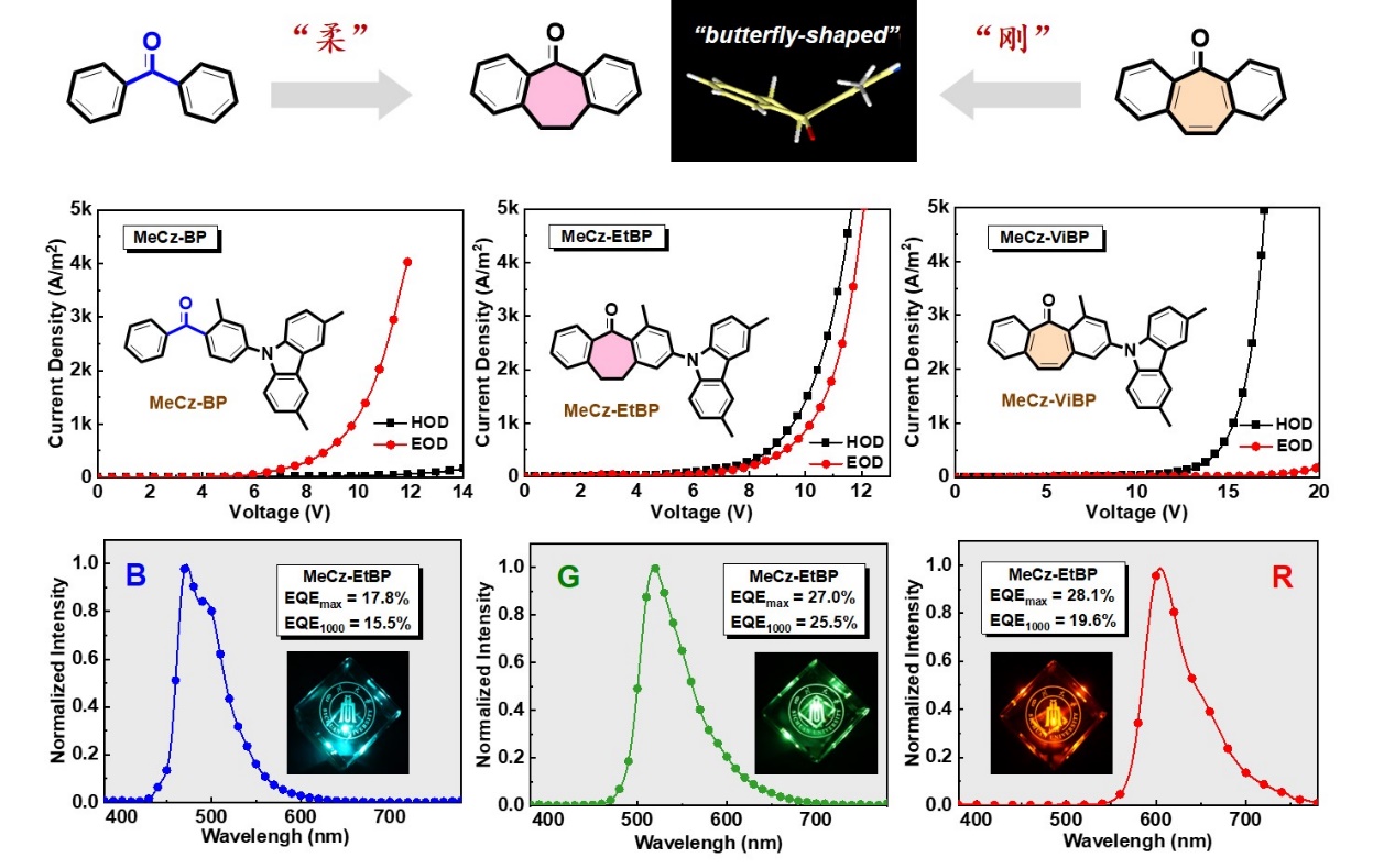 该工作中发展的柔性亚乙基连接的二苯并环庚酮受体不仅具有非环结构的可旋转性(柔性),可以减小分子间紧密堆积造成的激子淬灭,而且也具有环状结构的刚性,能抑制因分子内过度旋转造成的非辐射跃迁。通过与甲基咔唑相连制备得到双极性主体材料,其展现出非常平衡的载流子传输特性和良好的光物理和热稳定性,是实现高效率和低效率滚降OLED器件的关键。