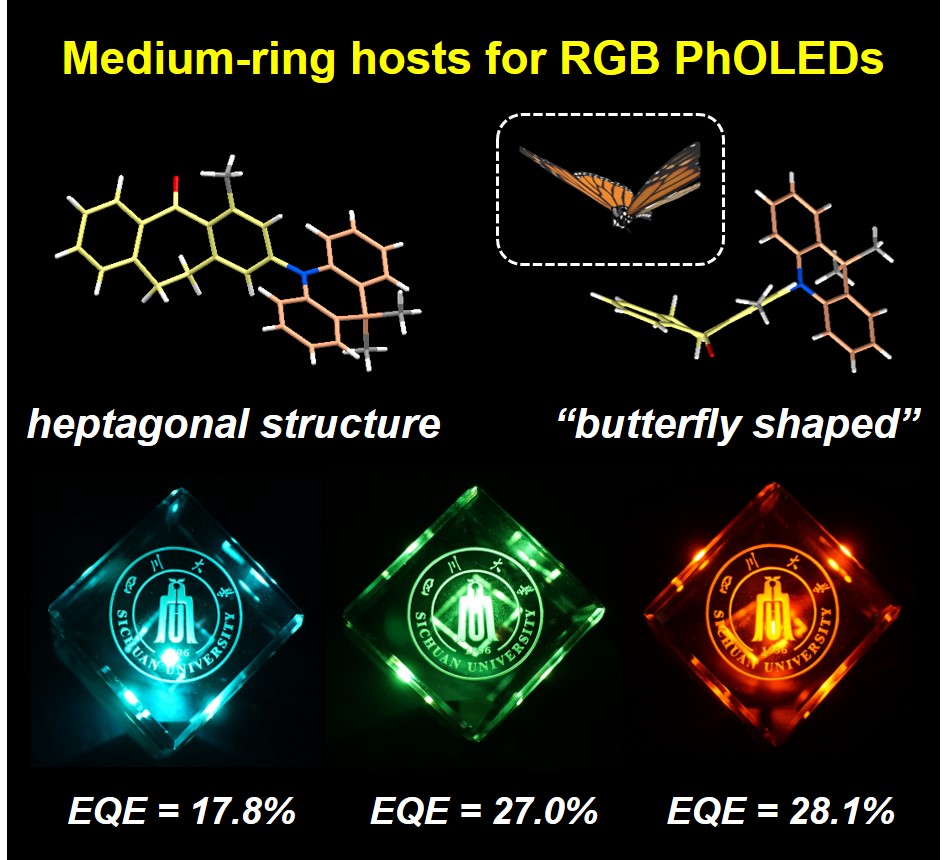 该研究以“Structurally Nontraditional Bipolar Hosts for RGB Phosphorescent OLEDs: Boosted by a “Butterfly-Shaped” Medium-Ring Acceptor”为题目发表在Angewandte Chemie International Edition上,英国上市公司365为第一单位,化学学院游劲松教授和宾正杨副研究员为该论文通讯作者,马蔚欣博士为论文的第一作者。特别感谢国家自然科学基金委、四川省科技厅、英国上市公司365的经费支持。