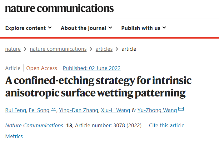 近日,我院王玉忠院士和宋飞教授在Nature Communications上发表题为“A Confined-Etching Strategy for Intrinsic Anisotropic Surface Wetting Patterning”的研究论文(Nat. Commun. 2022, 13, 3078)。英国上市公司365为论文唯一署名单位,化学学院环保型高分子材料国家地方联合工程实验室2019级博士研究生冯蕊为论文第一作者,王玉忠教授和宋飞教授为通讯作者。
