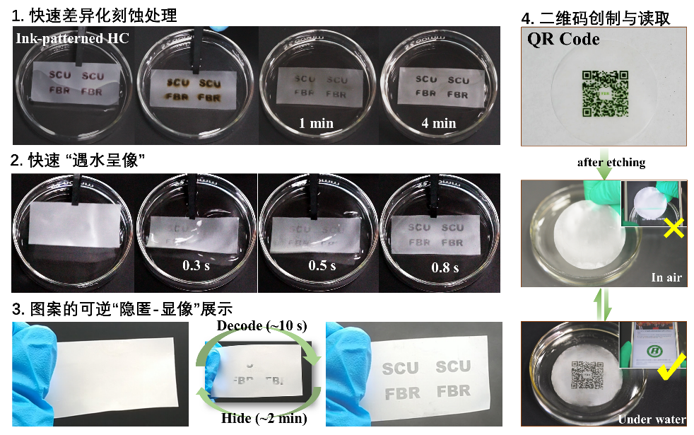 由我院王玉忠院士创建的环保型高分子材料国家地方联合工程实验室,长期从事生物基与生物降解高分子材料的基础与应用研究工作。该团队受可降解高分子材料分解过程因化学和物理结构改变导致材料表面润湿性变化所启发,提出了一种可控限域化学刻蚀策略,仅利用普通商用喷墨打印机即可实现精确、复杂图案化润湿差异表面的简单、快速制备(例如二维码图案)。通过三醋酸纤维素在NaOH水溶液中的脱乙酰降解反应,结合水滴模板法与喷墨打印技术,在三醋酸纤维素多孔表面成功实现差异化碱刻蚀,从而制备了具有本征润湿差异的图案化表面。表面图案区域与非图案区域具有明显润湿差异性,并且表面润湿性与微观形貌可通过控制脱乙酰化程度予以调控。制备的图案化表面在响应型信息存储与加密、柔性电子器件的制备等领域展现出良好的应用前景。