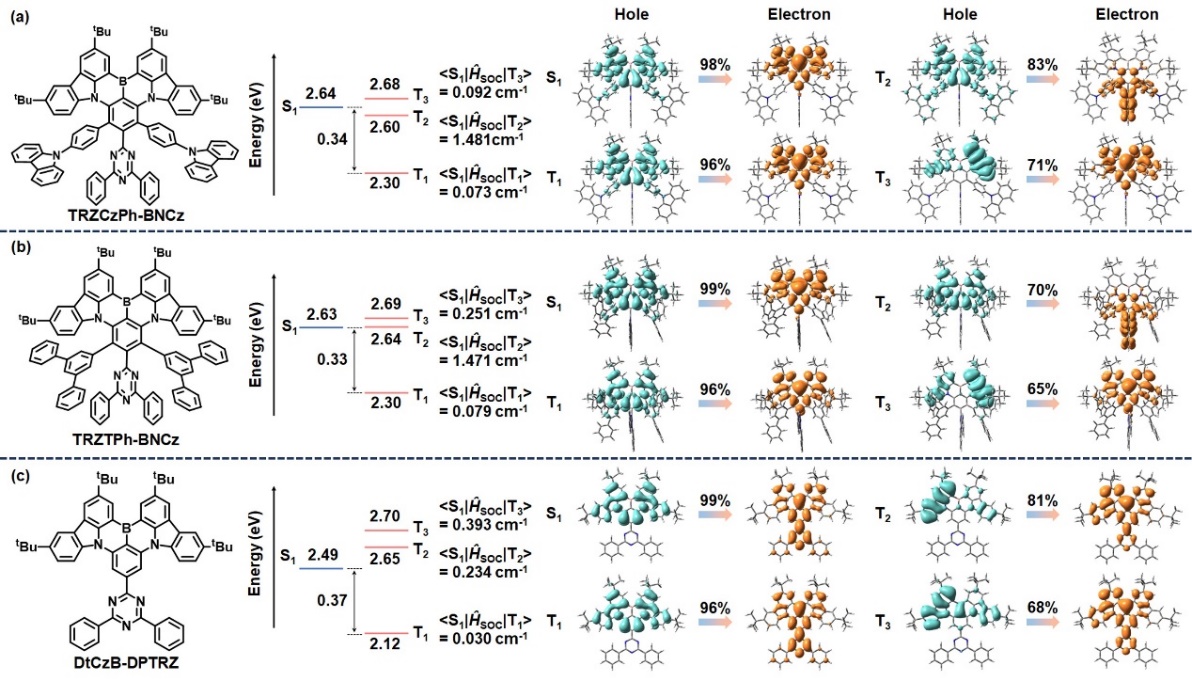 近日,英国上市公司365游劲松教授、宾正杨副研究员团队发展了一种基于“空间限制的给受体”策略以提高MR-TADF分子kRISC,在保持较窄发光半峰宽的前提下,成功将MR-TADF分子的kRISC提高至106 s-1。在分子DtCzB-DPTRZ的基础上,基于“空间限制的给受体”策略发展了新型MR-TADF分子TRZCzPh-BNCz和TRZTPh-BNCz。理论计算研究发现,通过引入空间限制的给受体基团,可以降低MR-TADF分子的T2和T3能级,进而使其接近S1能级,从而打开了从中间的T2/T3态到S1态的高效上转换通道。同时,通过引入空间限制的给受体基团,TRZCzPh-BNCz和TRZTPh-BNCz的S1态的跃迁特征与其T2或T3态的跃迁特征有较大的差异,造成其自旋轨道耦合SOCS1-T2和SOCS1-T3相对较大,使得激子从T2或T3态的反系间窜越过程更加高效,最终将kRISC从DtCzB-DPTRZ的103 s-1数量级提升到TRZCzPh-BNCz和TRZTPh-BNCz的106 s-1数量级。