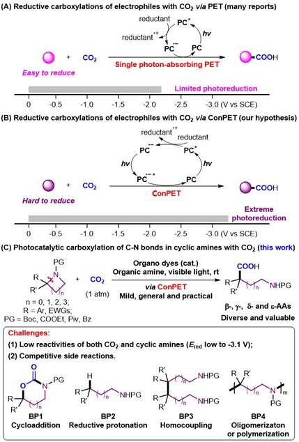 二氧化碳(CO2)具有无毒、储量丰富和廉价易得等性质,是有机合成中的优良碳一资源。其中,CO2参与的羧基化反应是构建高附加值羧酸类化合物的重要途径。另一方面,可见光催化由于具有绿色、条件温和等特点,近年来被广泛运用于CO2参与的还原羧基化反应中,避免了敏感有机金属试剂的制备和使用,提高了反应的步骤经济性和实用性。然而,由于产生活性光催化剂过程中的能量损失,单光子吸收过程的光催化体系往往还原能力有限(通常>-2.2 V vs SCE),难以实现还原惰性底物的羧基化反应。相反,新兴的连续光致电子转移(ConPET)策略通过一个催化循环中吸收两个光子,可以在温和条件下达到很低的还原电势(低至-3.4 V vs SCE),从而能够实现惰性底物的还原活化。然而,该策略很少应用于CO2参与的羧基化反应中。