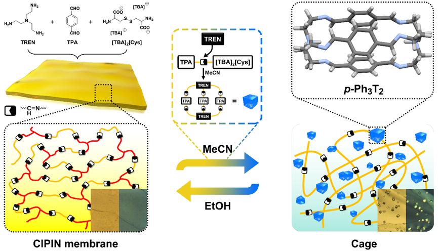 近日,我院何玲教授和陶国宏教授研究团队首次将胱氨酸离子液体设计到聚亚胺网络中,制备出一种柔性的动态离子聚亚胺膜材料。并基于离子液体可调的反应活性,提出了一种溶剂响应性策略,成功实现无定型离子聚亚胺薄膜和结晶型多孔有机分子笼之间的智能切换,该转换过程是完全可逆且可控的。这主要源于这两种材料都遵循DCvC原理,且共享着相同的单体构建模块,因此可以通过离子液体在乙醇和乙腈溶剂中氨基活性的差异,进而从热力学上控制亚胺键的自适应行为。为了适应溶剂环境的限制,其中的醛和胺组分会进行自我修正,形成热力学稳定产物。研究表明,无序的聚亚胺薄膜在乙腈中可以转换成结晶的有机分子笼,反之,将分子笼晶体置于乙醇中可以再次获得聚亚胺膜。这样膜-笼的相互转换可以不断循环。理论计算结合实验数据表明氨基酸离子液体中α位羧基和氨基间的内氢键效应是离子聚亚胺膜-分子笼可逆可控转换的关键。这项工作在聚合物网络和结晶分子之间建立了一座桥梁,并为智能动态材料提供了参考。