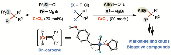 针对上述合成难题,曾小明团队以廉价二氯化铬为催化剂前体,有效地实现了惰性偕二氟代烃与有机镁及氯硅烷/对甲苯磺酸盐之间的三组分偕型交叉偶联、构建前手性的叔碳和季碳中心。并以环状单氨基卡宾-铬络合物为前体、通过镁还原生成零价铬,将其与偕二氟代烃反应。高分辨质谱检测到烷基卡宾-铬中间体,暗示铬金属可连续活化偕二碳-氟键、生成Fischer型铬-卡宾中间体。通过与中科院化学所陈辉研究员合作,理论计算表明低价铬活化偕二碳-氟键克服较低能垒、形成的铬-卡宾优先与格式试剂反应、进而活化氯硅烷形成硅自由基、采用独特的内层自由基偶联形成碳-硅键。该三组分偕型交叉偶联可用于高效合成多种抗癌分子及市售药物,为快速构建含叔碳和季碳的分子砌块提供了新策略。