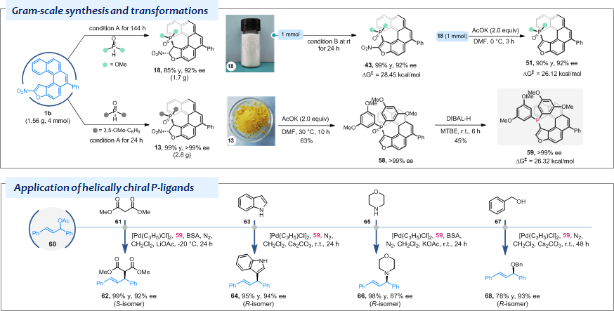 该反应表现出非常优秀的反应活性、对映选择性和底物普适性,并且能够实现“克级规模”制备。利用这一方法,作者进一步开发并合成了一系列新型的螺旋手性膦配体及催化剂,这类螺旋手性膦配体也被成功应用于Pd催化的不对称烯丙基烷基化、氨基化、芳基化、以及羟基化等若干反应中,取得了优异的催化结果,这表明该类螺旋手性膦配体在不对称催化领域具有重要应用潜力。