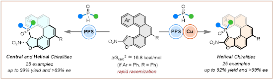 近日,我院王天利教授团队通过对有机反应进行巧妙和理性设计,以手性肽-季鏻盐作为有机催化剂,利用不对称phospha-Michael加成反应、以及phospha-Michael加成/铜催化氧化芳构化串联两种反应策略,以动态动力学拆分方式首次实现了两类新型含磷螺旋手性分子的高效不对称合成。