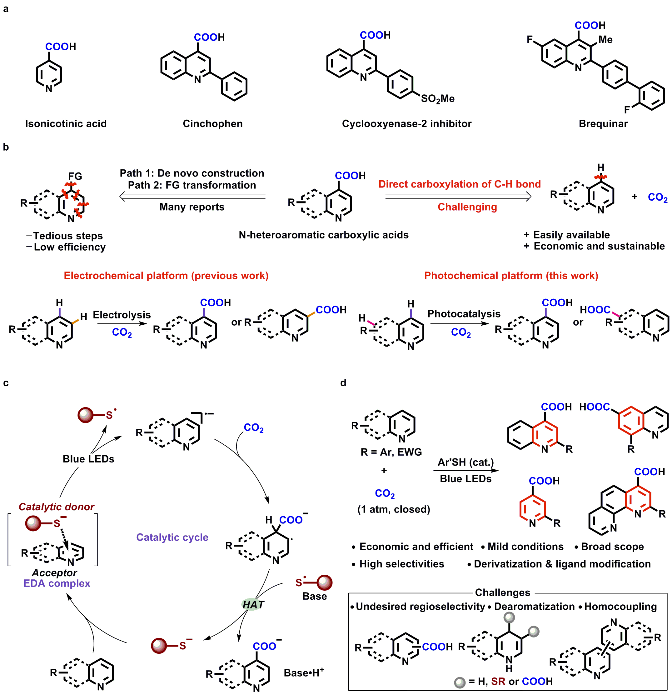 我院余达刚教授和叶剑衡研究员团队坚持围绕在温和条件下实现CO2高效活化和选择性转化的关键科学问题开展研究(综述:化学学报, 2019, 77, 783; Acc. Chem. Res. 2021, 54, 2518; 高等学校化学学报, 2022, 43, 20220255; Natl. Sci. Open 2023, 2, 20220024; Sci. Bull. 2023, 68, 3124. 代表性论文:Nat. Catal. 2021, 4, 304; Nat. Catal. 2022, 5, 832; Nature 2023, 615, 67; Nat. Catal. 2023, 6, 959.),在前期利用可见光和硫酚促进CO2高效活化和转化(代表性论文:Angew. Chem. Int. Ed. 2017, 56, 15416; CCS Chem. 2021, 3, 1746; Sci. China Chem. 2023, 66, 1457.)的研究基础上,最近实现了可见光促进硫酚催化CO2参与的氮杂芳烃C(sp2)–H键羧基化反应,高效高选择性合成了氮杂芳烃羧酸。该团队利用硫酚负离子与氮杂芳烃形成电子转移复合物(EDA复合物),在可见光作用下生成了硫自由基与氮杂芳烃自由基负离子,随后进攻CO2得到去芳构化羧基化自由基中间体,并进一步通过氢原子转移(HAT)过程实现再芳构化生成氮杂芳烃羧酸同时再生硫酚催化剂。该反应具有良好的底物适用性和官能团兼容性,且能实现喹啉类底物C-4位或C-6位的选择性羧基化反应。基于机理研究和理论计算,该团队阐明了硫酚负离子与非活化氮杂芳烃形成EDA复合物的反应新机制,实现了氮杂芳烃的高效单电子还原,为氮杂芳烃C–H键选择性官能团化提供了新途径。