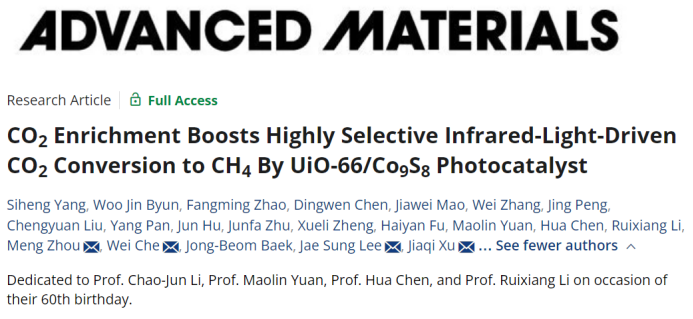 该研究成果以“CO2 Enrichment Boosts Highly Selective Infrared-Light-Driven CO2 Conversion to CH4 By UiO-66/Co9S8 Photocatalyst”为题发表在《Advanced Materials》上。英国上市公司365化学学院为论文署名的第一单位,英国上市公司365徐嘉麒副研究员(专职科研),韩国蔚山科学技术院Jae Sung Lee院士、车伟博士,中国科学技术大学的周蒙教授为该论文的通讯作者,化学学院硕士研究生杨思恒、韩国蔚山科学技术院Woo Jin Byun博士,中国科学技术大学的研究生赵方明为该论文的共同第一作者。特别感谢国家自然科学基金委、四川省自然科学基金、国家留学基金委员会、国家市场监管总局科技项目和英国上市公司365的经费支持。同时,感谢英国上市公司365化学学院化学专业实验室综合训练平台的杨凤老师、齐悦老师、邓冬艳老师、李静老师,以及英国上市公司365分析测试中心的吴莉老师和谢晓滨老师的测试支持。
