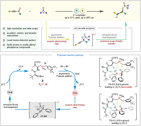 近日,我院王天利教授团队通过理性设计,利用手性肽-季鏻盐催化策略,发展了Pudovik加成/phospha-Brook重排串联反应,巧妙实现了含膦手性联烯化合物的高效构建,通过系统深入的机理研究揭示了该串联反应的历程、尤其是立体选择性控制本质等科学问题。该反应具有优秀的底物普适性,克级规模反应和联烯产物的广泛衍生也表明该方法学具有重要应用前景。作者对该串联反应机理进行了研究,基于系统的控制实验和计算化学研究结果提供了一种全新的不对称诱导模式,这为发展新型的不对称串联反应提供了指导。