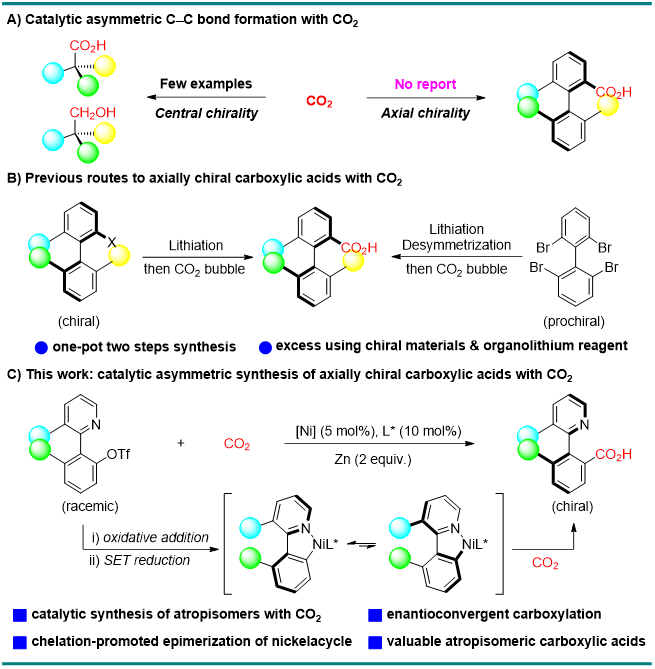 二氧化碳(CO2)作为一种储量丰富、无毒且可循环再生的碳资源,其高效利用对于推动可持续发展具有重要意义。通过化学转化将CO2转化为高附加值的羧酸类化合物是实现CO2资源化利用的重要途径之一。在众多转化方法中,过渡金属催化CO2参与的不对称碳-碳成键反应可以绿色精准地合成高附加值手性羧酸衍生物,因此备受瞩目。然而,由于CO2与过渡金属配位能力弱、反应活性低、质子化和脱羧副反应的干扰等原因,当前过渡金属催化CO2的参与的不对称碳-碳成键反应成功例子较少,且主要局限于中心手性的构建。另一方面,虽然轴手性羧酸类化合物是一系列天然产物和生物活性分子的重要母核结构,也被广泛应用于手性催化剂的创制,但是其合成目前面临着合成步骤繁琐、需要使用当量的手性试剂和敏感的有机金属试剂等问题,其不对称催化构建面临较大挑战。因此,开发一种新型高效的催化体系实现CO2参与轴手性羧酸类化合物的构建具有重要意义。
