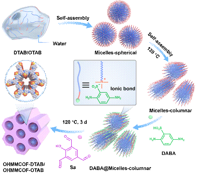 图1 有序层次微孔/介孔脱模板前预产物OHMMCOF-DTAB/OHMMCOF-OTAB的合成.