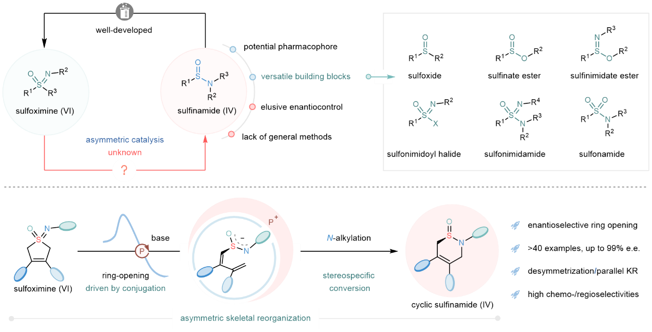 亚砜胺是一类重要的含硫中心手性化合物,这类化合物常常具有独特的结构和物理化学性质,在药物创制与开发、配体及催化剂的设计等领域备受瞩目。然而,由于缺乏理性的底物设计、合适的反应类型、以及高效高选择性的催化剂体系,手性亚砜胺化合物的催化不对称合成仍面临着艰巨挑战。