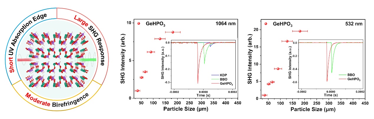 近日,我们提出了功能基元序构策略,通过计算辅助筛选出日盲区紫外潜在功能基元GeO3基团,理性设计并合成了两种优异的范德华层状日盲区紫外光学晶体:具有类黑磷结构的非线性光学晶体GeHPO3和具有类石墨烯结构的双折射晶体K(GeHPO3)2Br。其中,GeHPO3是首个报道的Ge(II)基氧化物非线性光学晶体,具有卓越的二次谐波响应,短的紫外吸收截止边和适中的双折射率。这些特性表明GeHPO3是一种非常优异的日盲区紫外非线性光学材料。这一研究不仅开创了日盲区紫外光学材料研究的新体系,为开发Ge(II)基光电材料提供了关键的实验见解,还为设计具有定制性能的结构驱动型功能材料提供了战略蓝图。