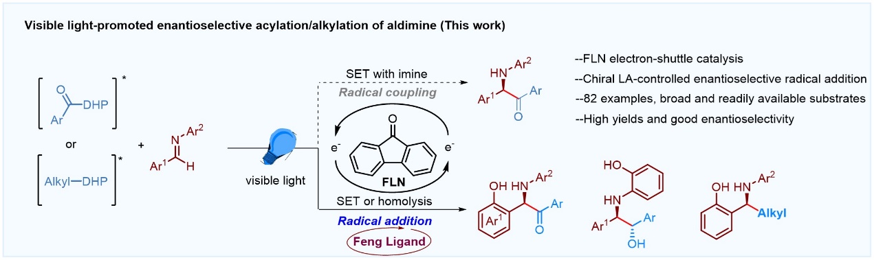 酰基自由基作为一类特殊的sp2杂化亲核自由基,为α-氨基酮的合成提供了一种新的极性反转策略。然而,酰基自由基作为一类瞬态自由基,具有高活性、易淬灭、小位阻等特点,这也极大的影响了其在不对称合成领域的发展。近日,冯小明院士及刘小华教授团队报道了可见光与手性Lewis酸协同催化实现对醛亚胺的不对称自由基酰化反应,在该过程中创新性地引入“芴酮电子梭催化”,可以高收率、优异的对映选择性得到一系列手性α-氨基酮及β-氨基醇化合物。并且该方法学也具有良好的普适性,可以进一步扩展至烷基自由基对醛亚胺底物的不对称加成反应,得到手性胺化合物。作者通过一系列控制实验及机理实验证明了该反应经历自由基加成机理,并且“芴酮电子梭催化”在该反应过程中起到了举足轻重的作用:首先,芴酮的加入改变了反应历程,抑制了由激发态汉斯酯底物通过自身均裂产生酰基自由基,进而发生HAT过程对自身的消耗,提高了反应的收率;其次,芴酮的加入改变了反应的决速步,使得酰基自由基生成速率可调控,辅助对映选择性控制。