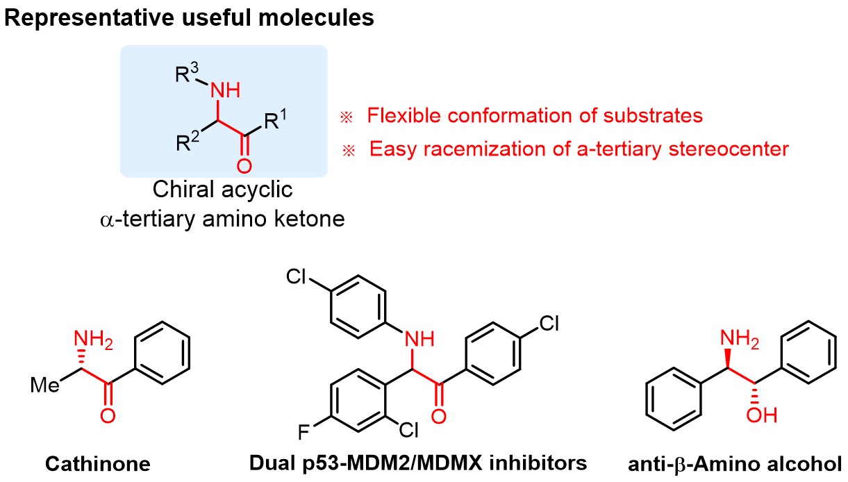 开发新的不对称合成方法用于构建有用的反应砌块或关键结构单元一直是化学家们的重要任务之一。其中,非环状α-叔碳氨基酮骨架广泛存在于各类天然产物以及药物分子中,例如生物碱卡西酮以及P53-MDM2/MDMX抑制剂等。并且通过简单还原就可以得到高利用价值的β-氨基醇类化合物。尽管其在合成及药物化学领域具有重要的地位,但发展直接而高效的策略合成该骨架仍然面临着巨大的挑战:首先,羰基α-位氢原子表现出一定的酸性,易烯醇化导致消旋;其次,相比于环状α-叔碳氨基酮骨架在不对称合成过程中可以借助底物本身构象的诱导,非环状氨基酮的合成在手性控制时将面临底物柔性骨架带来的挑战。