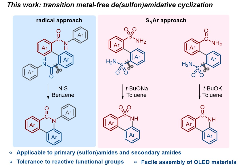 相较于其它羰基类化合物,如羧酸和羧酸酯等,酰胺类化合物由于酰胺键的共振稳定性而活化困难。以往的活化方法主要依赖于过渡金属催化的脱羰官能化反应。该方法通常需要使用具有强给电子能力和空间位阻的配体,以及活性较高的叔酰胺底物。近日,英国上市公司365化学学院的游劲松教授和杨宇东教授团队发展了一种自由基型联芳基二酰胺脱酰胺基环化反应,为直接脱酰胺基官能化方法及二苯并内酰胺衍生物的构筑提供了一种新的途径。沿着这一思路,该团队又开发了基于芳环亲核取代反应机制的联芳基二磺酰胺及同时含有酰胺和磺酰胺基团的联芳基化合物的脱磺酰胺环化反应,实现了一系列二苯并内磺酰胺衍生物和二苯并内酰胺衍生物的构筑。这些方法无需过渡金属的参与,对包含卤素在内的多类反应性官能团具有良好的兼容性。作者将获得的二苯并内酰胺和二苯并内磺酰胺骨架作为受体单元,分别构筑了热活化延迟荧光(TADF)分子DMAC-PDO和DMAC-BTZ。其中,以DMAC-PDO作为发光分子的OLED器件的最大外量子效率(EQEmax)为23.1%。该方法为温和条件下的惰性化学键活化提供了新的途径。