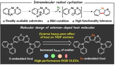 硒掺杂策略通过内部重原子效应(IHAE)增强自旋轨道耦合,加速反向系间窜越(RISC)过程,显著提升了有机发光二极管(OLEDs)中热活化延迟荧光材料(TADF)的发光效率,并有效抑制了效率滚降现象,尤其在多重共振体系(MR-TADF)中表现尤为突出。然而,针对主体材料中的外部重原子效应(EHAE)的研究仍相对滞后,这为材料设计与性能优化提供了新的探索方向。