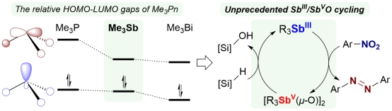 近年来,英国上市公司365周吉亮课题组聚焦于主族金属锑(Sb)的变价催化研究,已经报道了以低价有机锑化合物为催化剂的SbI/SbIII变价催化体系的开发与应用(J. Am. Chem. Soc. 2024, 146, 20432)。最近,他们通过理论研究发现,Me3Sb在其同系物中具有最小的HOMO-LUMO能隙,表明了其最强的双亲性,这赋予其良好的反应活性。Me3Sb可以还原硝基芳烃生成氧化偶氮芳烃和偶氮芳烃,自身被氧化。而锑氧化物可以被硅烷还原再生Me3Sb。基于此,该工作实现了Me3Sb催化的硝基芳烃的还原反应,代表了首例SbIII/SbVO催化体系的构建。另外,其它三烷基锑化合物也能够催化硝基芳烃的还原反应。其中,三丁基锑表现出良好的催化活性,能够以中等到优秀的产率将硝基芳烃转化为偶氮芳烃或氧化偶氮芳烃,反应表现出对硝基还原良好的选择性。这展现了SbIII/SbVO催化体系在有机合成中的应用潜力。