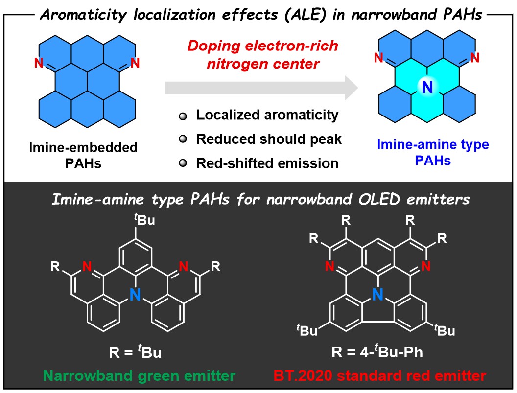 近日,英国上市公司365游劲松教授与宾正杨教授团队在多环芳烃窄光谱荧光材料领域取得重要突破,提出了"芳香性定域效应"(Aromaticity Localization Effects, ALE)这一全新概念,为窄光谱OLED发光材料的设计开发提供了突破性的理论指导。通过系统的理论计算和实验验证,作者证明了多环芳烃分子的芳香性与其发光光谱性质存在显著相关性。具体而言,通过调控多环芳烃分子的芳香性,可有效抑制发光光谱中的肩峰强度,从而实现高色纯度的窄光谱发射,这一发现被定义为"芳香性定域效应"。基于这一理论,通过在团队前期开发的亚胺嵌入的稠杂多环芳烃体系(J. Am. Chem. Soc. 2024, 146, 15977)引入富电子三芳胺氮原子,他们成功构建了独特的"亚胺-苯胺型"多重共振体系。这一分子设计具有以下优势:一方面,通过不同电性氮原子间的多重共振作用,实现了前线分子轨道在氮原子及芳环骨架上的局域化分布,从而在发光中心实现芳香性定域现象,使发光半峰宽得到显著降低;另一方面,三芳胺氮原子的引入增强了分子内的短程电荷转移性质,实现了显著的发光红移,有效解决了传统硼氮共振体系在实现红光发射方面的关键技术瓶颈。基于以上分子设计策略,团队成功开发出一系列窄光谱发光材料,涵盖绿光、黄光至深红光波段。特别值得关注的是,具有芳香性定域特征的II-b化合物表现出优异的深红光发射特性:其最大发射波长达到660 nm,半峰宽仅为35 nm(0.10 eV)。此外,基于II-b的OLED器件实现了符合BT.2020标准的深红光发射,CIE色坐标达到[0.71, 0.29]。这一突破性进展不仅验证了芳香性定域效应的科学价值,更为发展下一代广色域OLED高清显示技术提供了重要的材料基础和技术路径。