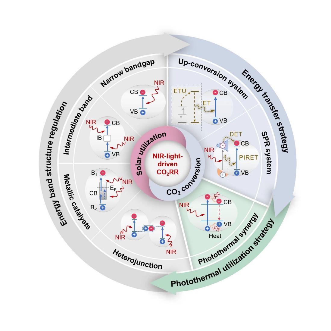 光驱动的二氧化碳(CO2)转化是促进CO2资源化利用的一种有效的途径。然而,过去报道的绝大多数光催化剂只能利用紫外到可见波段的光,而能量较低的近红外光(约占50%的太阳光谱)则无法被有效利用。为了实现太阳能的最大利用,如何高效地利用近红外光驱动CO2还原已成为近年来该领域的研究热点之一。为了更好地推动该研究领域的发展,该综述系统地介绍了近红外光驱动二氧化碳还原的机制和原理,近红外光催化剂的设计策略(包括能带工程策略、能量转移策略和光热利用策略),以及这些策略的代表性应用。最后,该综述系统阐述了近红外光驱动CO2转化所面临的主要挑战,并就未来研究中催化剂的优化设计、表征方法、评估流程以及潜在的大规模应用提出了建议。随着近红外光驱动CO2转化技术的不断发展,有望最大程度地利用太阳能,最终推动CO2光催化转化技术的工业化应用。