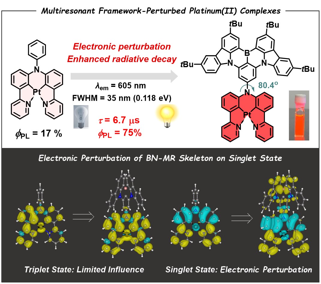 近日,英国上市公司365游劲松教授团队的宾正杨教授、高戈教授与苏州大学陈先凯教授合作,提出了一种利用硼氮骨架对金属铂配合物进行微扰以增强磷光的策略,成功构筑了新型高效窄光谱红光发光材料体系。研究发现,将硼氮骨架与弱发光的铂配合物进行正交结合,可以在基本维持磷光三线态发光波长和半峰宽的前提下,硼氮骨架的单线态强辐射跃迁可有效增强磷光跃迁偶极矩,从而显著提升发光效率。该工作不仅开发了一类新型高效的窄光谱红光磷光材料体系,更揭示了一种基于硼氮骨架与铂配合物微扰的发光增强机制,为发展高性能窄光谱磷光材料提供了新思路。