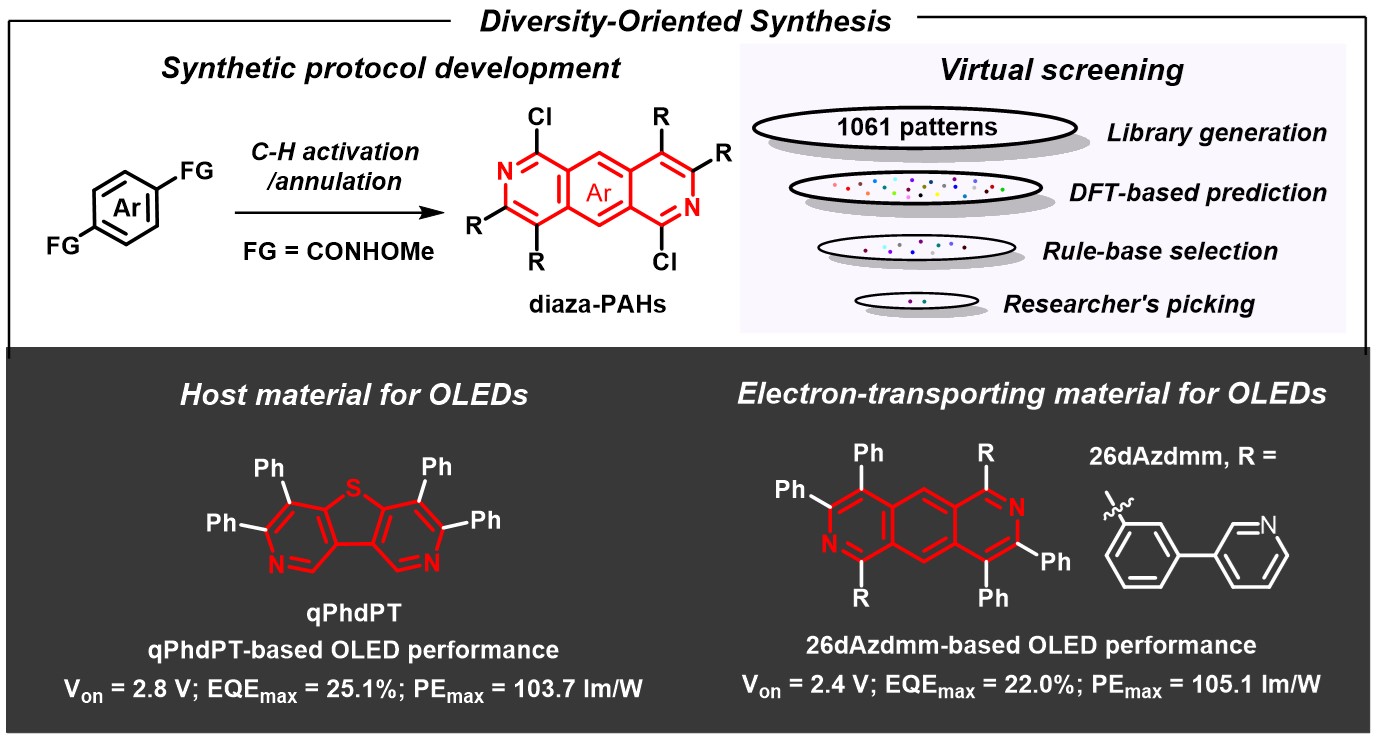 该团队提出了一种将DOS与虚拟筛选相融合的策略,以此系统探索二氮杂稠环芳烃在OLED应用中的化学空间。此方法巧妙借鉴了药物研发领域的DOS策略,将其作为构建结构多样性分子库的有力工具,成功构筑出具有潜在OLED功能的新型二氮杂多环芳烃分子库。同时,通过采用铑催化的连续C‒H活化/环化反应,建立起电子特性可调的二氮杂稠环芳烃合成方案。在此基础上,结合虚拟筛选技术,对1061个二氮杂稠环芳烃骨架进行计算机筛选,最终锁定2,6-二氮杂蒽与2,8-二吡啶并噻吩两种分子骨架作为OLED材料原型。在计算模拟的精准指导下,团队成功合成出四种二氮杂稠环芳烃衍生物,通过系统性的光电性质研究,最后将其分别用作电子传输材料和主体材料,制备出高性能的磷光OLED器件。