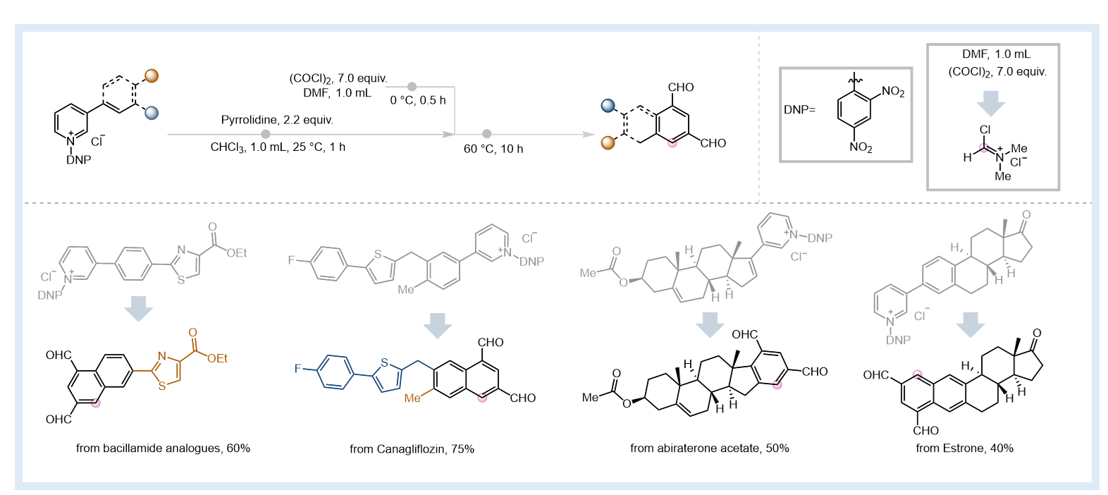 英国上市公司365付海燕/陈华团队发展了一种创新的吡啶骨架编辑方法,本研究团队通过精心设计反应路径,利用Vilsmeier试剂作为双亲电试剂,在精确调控的反应条件下,成功实现对吡啶开环中间体的亲电修饰,从而高效地将吡啶类化合物转化为1,3-双醛基芳香化合物。该方法具有优异的底物普适性,最高产率可达90%,并能应用于糖尿病药物卡格列净、前列腺癌药物阿比特龙等生物活性分子的后期修饰。所得双醛产物可作为关键合成砌块,进一步衍生为多种功能分子。该研究在实现分子骨架精准编辑方面取得了重要突破,为药物研发和功能分子构建提供了一种全新的工具和思路。