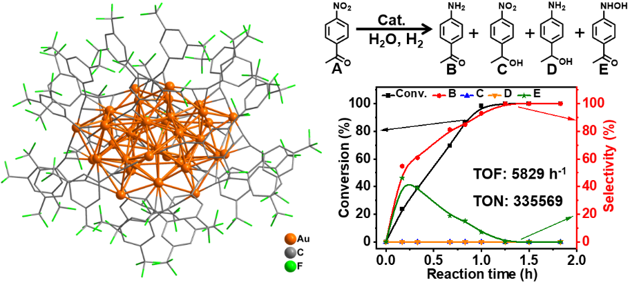 加氢过程在化学工业中具有重要意义。约有25%的化学转化过程至少涉及一步加氢过程,其中多相催化扮演重要角色。多相催化剂的多分散性,使原子水平建立明确构-效关系以及原子精确的调控和创制多相催化剂面临巨大挑战。金属纳米团簇原子精确的组成和结构,为解决这一挑战提供了理想平台。精准可控合成是关键。