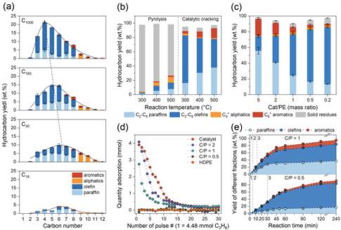该研究以“Efficient Conversion of Polyethylene to Light Olefins by Self-confined Cracking and Reforming”为题目发表在Nature Communication上,英国上市公司365化学学院为第一单位,化学学院张帆教授和石科院李明丰高工、煤化所刘星辰研究员、北大马丁教授为本文共同通讯作者,博士研究生董忠文和石科院彭博教授是论文的共同第一作者。特别感谢国家重点研发计划、国家自然科学基金委、四川省科技厅、和英国上市公司365的经费支持,同时感谢我校分析测试中心和我院测试平台在材料表征方面的大力支持。