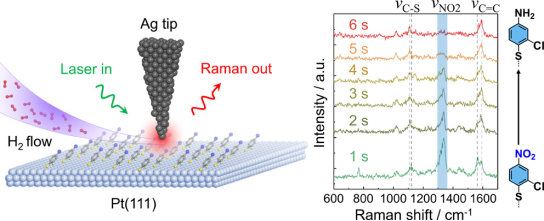 针对上述难题,蔡镇锋课题组基于在“表面反应过程原位表征”方向上的研究基础,与瑞士苏黎世联邦理工学院(ETH Zürich)的Naresh Kumar研究员与Jeremy O. Richardson教授合作,利用针尖增强拉曼光谱技术(Tip-enhanced Raman spectroscopy, TERS),结合模型表面体系与密度泛函理论(DFT)计算,成功实现了在Pt(111)单晶表面上分子氢活化及其驱动的卤代硝基苯硫酚(CNTP)选择性氢化反应的纳米级实时追踪。研究在单个纳米反应区间内(探测体积内分子数少于100个)直接观测到动态反应的特征振动演化过程,并在分子层面揭示了金属表面催化氢化的动力学过程。