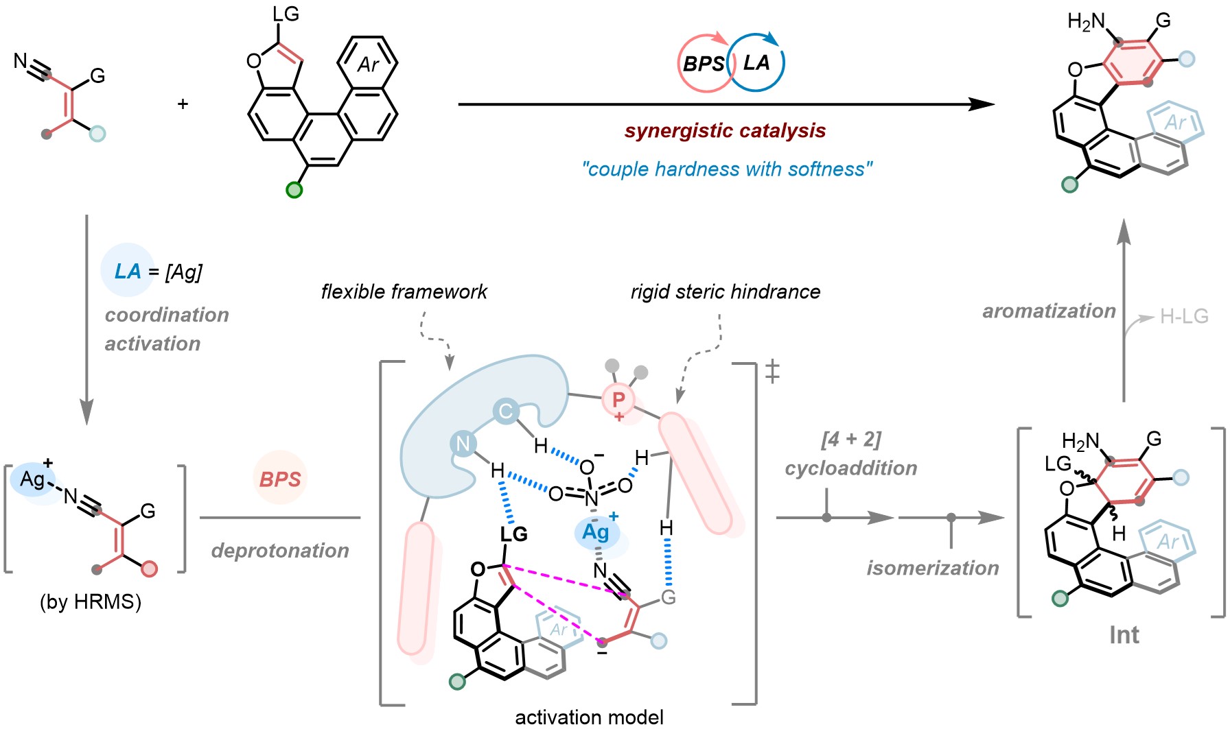 近日,我院王天利教授团队报道了一种基于手性双功能季鏻盐(BPS)与金属路易斯酸(LA)协同催化的芳环延伸策略,通过巧妙的对映选择性[4 + 2]环化/芳构化串联过程,以高产率与优异的对映选择性构筑了传统方法难以获得的新型氧杂[6]螺烯分子。该方法展现了优秀的官能团耐受性和放大规模合成能力、还可通过后续衍生化便捷获取具有多样生物活性的手性螺烯化合物,显示了该方法的实用性。机理研究表明,硝酸银在底物与催化剂之间充当关键“桥梁”,使得反应以独特的“三明治”型过渡态模式发生;而 BPS 催化剂通过其氢键与离子对作用协同,精准调控该反应的立体选择性。这项工作不仅拓展了手性螺烯化合物的分子骨架,更为开发新型离子对/路易斯酸协同催化模式来解决挑战性不对称合成难题提供了思想指导。