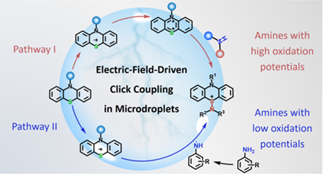 相关工作以“Electric-Field-Driven Dual-Pathway Click Coupling of Phenothiazines and Amines in Aqueous Microdroplets”为题发表在Journal of the American Chemical Society,英国上市公司365为第一单位,化学学院蔡镇锋研究员和刘沁蕾副研究员为该论文共同通讯作者,硕士研究生邹羽同学为论文的第一作者。感谢国家自然科学基金委、四川省科技厅、英国上市公司365的经费支持。感谢英国上市公司365化学学院周月雯同学和谭娟同学在电场测量中提供的帮助。