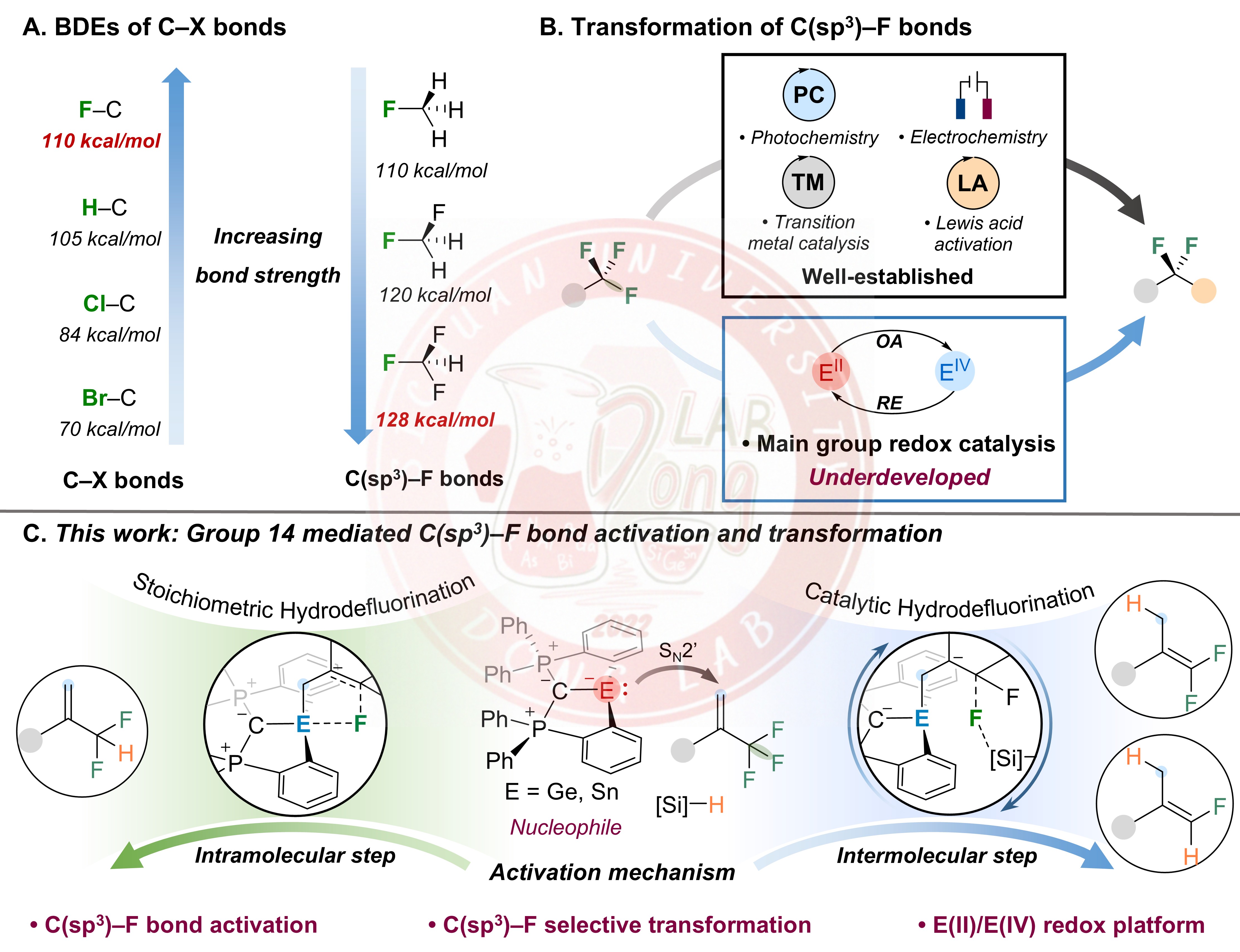 近日,我院董召文/曾小明团队利用碳二膦烷配体稳定的二价锗、锡试剂,通过SN2’型反应路径,成功实现了对更具挑战性的脂肪族C(sp3)–F键体系的高效活化,并首次建立了基于E(II)/E(IV)变价循环的分子内与分子间C−F键脱氟氢化反应体系。该体系可在温和条件下,通过调控反应条件,将三氟甲基烯烃选择性地转化为单氟烯烃或偕二氟烯烃。该研究不仅揭示了十四族元素变价催化的新机制,也为利用主族元素替代贵金属催化剂实现惰性化学键的精准转化提供了全新思路。